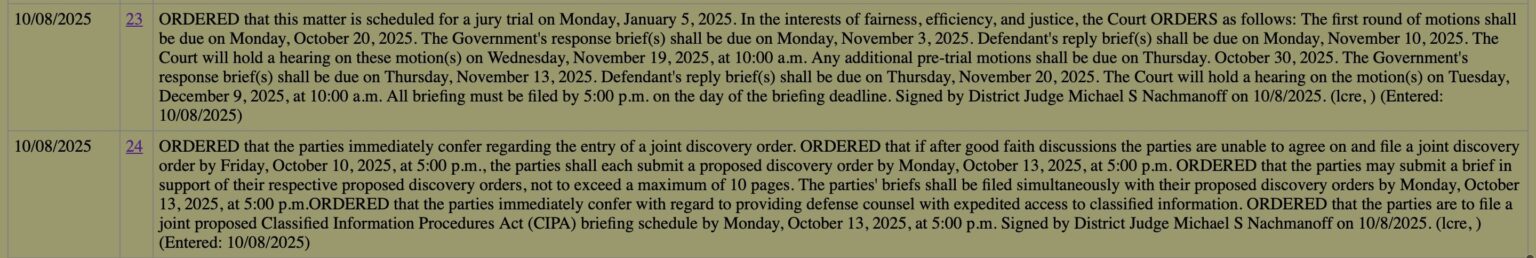 As noted by legal reporter Seamus Hughes, the order Nachmanoff signed setting forth the schedule for pre-trial motions, hearings, and the trial itself listed the trial date of “Monday, January 5, 2025” — that’s nine months ago in 2025, not 2026.